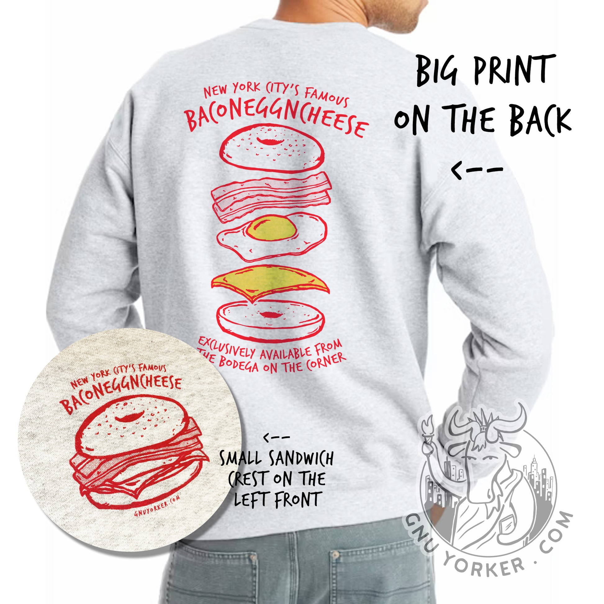 Hand printed BACONEGGNCHEESE sweatshirt with the small BEC crest on the front, and the full bacon egg and cheese design on the back!
