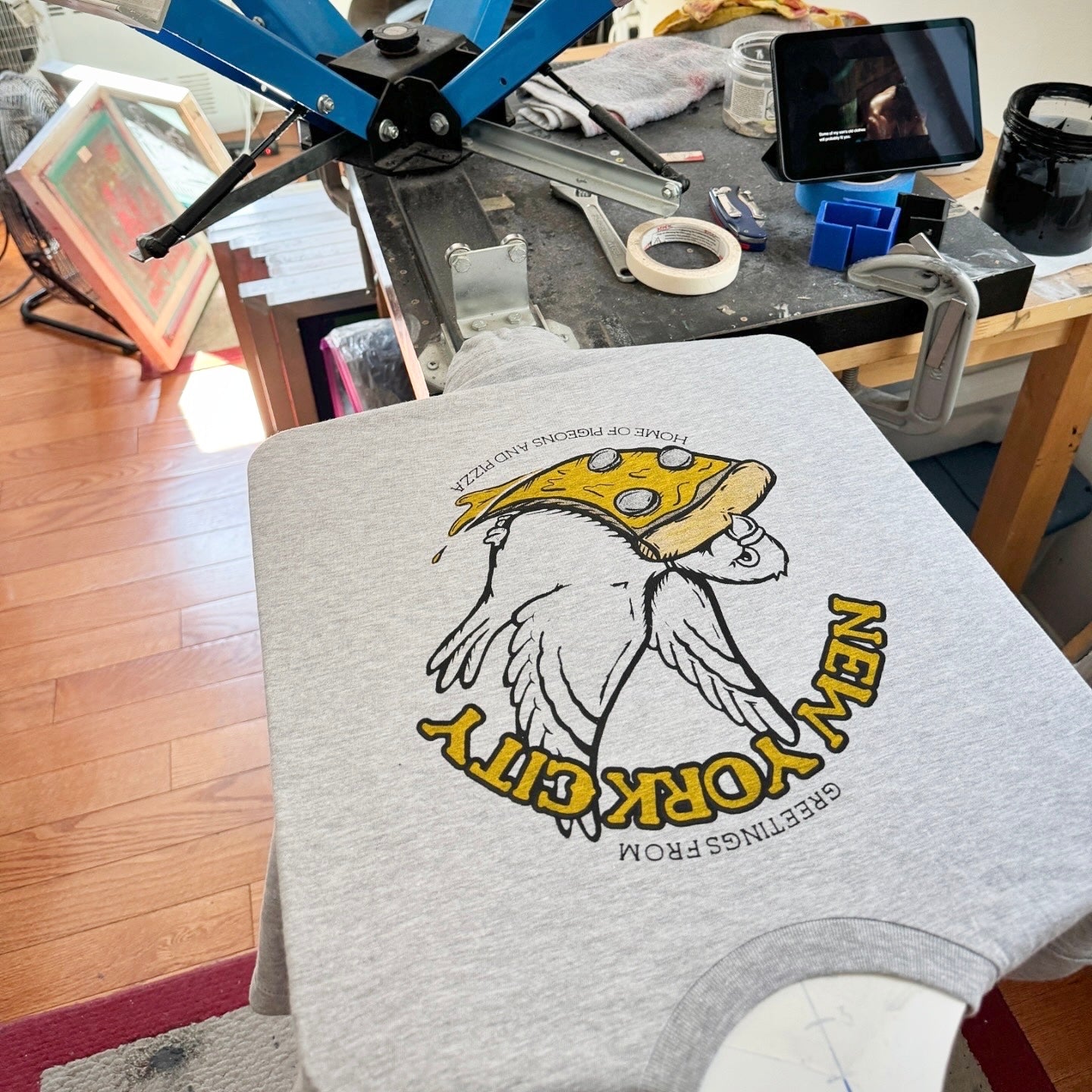 Currently printing with BLACK AND YELLOW ink on HEATHERED GREY t-shirts.